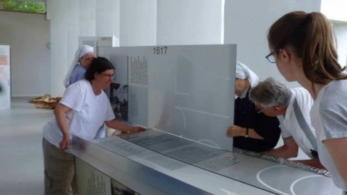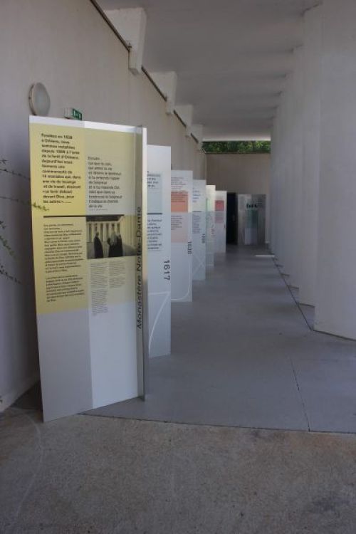 En fin de journée, je fais le tour du monastère. Quelques visiteurs se pressaient à la buvette, au stand philatélique ou au magasin. Mais mon attention s’est portée tout particulièrement sur les panneaux d’exposition que j’avais réalisé avec les bénédictines. Cachée discrètement derrière un pilier, j’observais les visiteurs qui s’y arrêtaient, lisaient, revenaient sur leur pas…