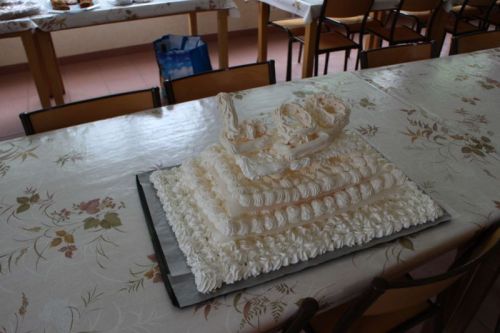 La journée festive se poursuit par un repas partagé (à consommer, sans modération, à l’intérieur ou dans le jardin). Chargée d’une assiette bien remplie, je fais le choix d’une dégustation à ciel ouvert. Je croise alors un groupe composé de sœur Marie-Emmanuel et sœur Anne : « Ah ! Voilà notre archiviste ! » s’exclament-elles. Elles m’invitent dans leur cercle où je retrouve quelques ursulines ainsi qu’une maman accompagnée de sa fille (qui passe le bac de français cette année, bonne chance à elle !) Le repas se termine par un dessert original, une sorte de pièce montée de meringues, dessinant un magnifique « 400 » en l’honneur du quatrième centenaire. (Quelle patience de la part du pâtissier !)