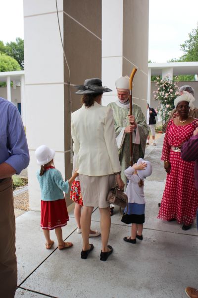 Le lendemain matin, je m’active avec mes bénédictines pour les derniers préparatifs jusqu’à la dernière minute ! J’arrive finalement sans retard pour assister à la célébration présidée par Monseigneur Blaquart, l’évêque d’Orléans. L’Église est pleine, les invitations envoyées aux nombreuses connaissances des bénédictines ont porté leurs fruits : la fête peut commencer. L’évêque nous rappelle durant la messe l’événement que nous célébrons aujourd’hui : les 400 ans de la Congrégation (aucune faute historique n’a été commise. Merci à Monseigneur Blaquart !)