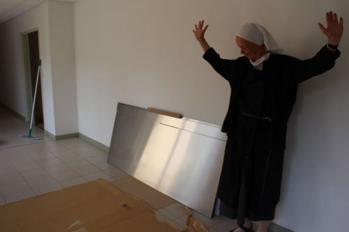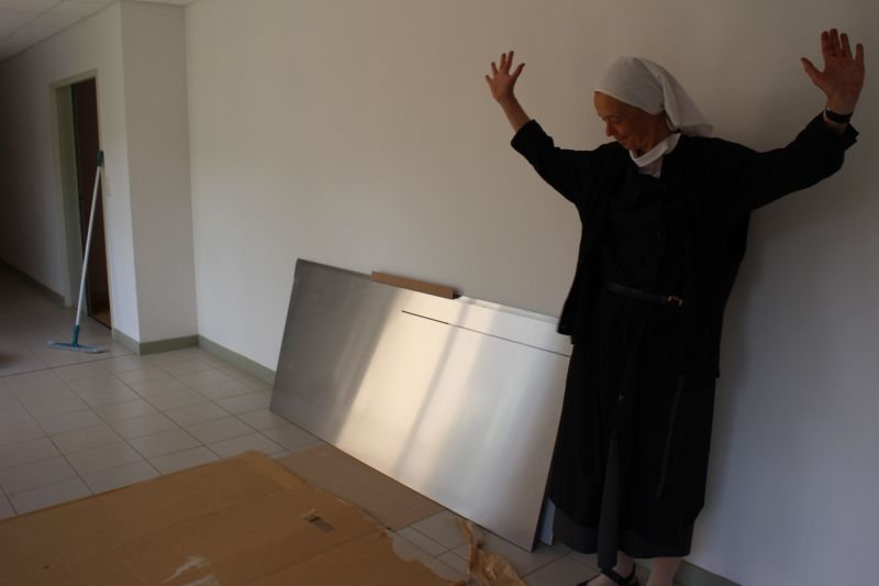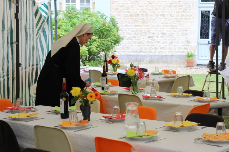 Les soeurs peuvent compter sur la bonne volonté des hôtes du monastère qui installent avec entrain les tables le matin des festivités. Vite! Vite! Plus qu'une heure avant la célébration de 10h30! Les premiers invités vont bientôt arriver!