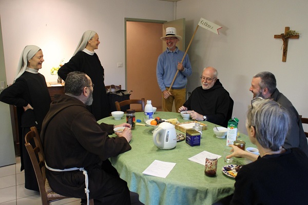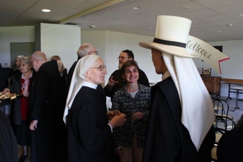 Outre les habits de fête (le voile bien ajusté pour les sœurs), nous revêtons joyeusement nos plus beaux sourires. Après Laudes, l'ambiance est bon enfant dans la salle à manger de l'hôtellerie. Autour d'un petit déjeuner gourmand (de la brioche!), les prieures et leurs invités plaisantent gaiement avec François (beau-frère de sr Dorothée) qui ne passera pas inaperçu au colloque du lendemain avec son magnifique chapeau aux couleurs des Bénédictines.