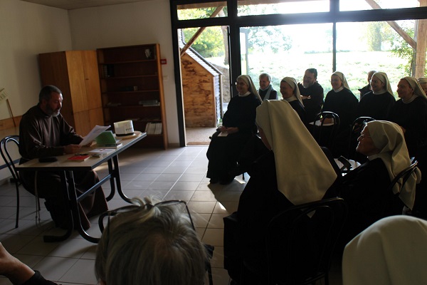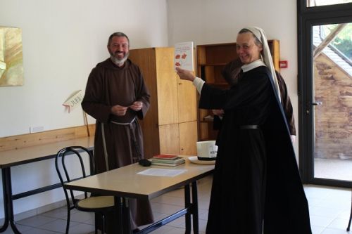 Tout redevient sérieux (ou presque) lorsque vient l'heure de la conférence du Père Eric Bidot, qui exhorte fraternellement ses soeurs bénédictines "à se souvenir et à créer" autour de trois mots clés: coeur, communion et passage. Une fois les esprits rassasiés, il est temps de rejoindre le réfectoire (les nappes brodées au nom du "Calvaire" sont de sorties!).