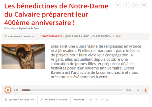 Vous pouvez réécouter l'émission sur le site RCF Anjou: https://rcf.fr/spiritualite/vie-de-leglise/les-benedictines-de-notre-dame-du-calvaire-preparent-leur-400eme-anniver