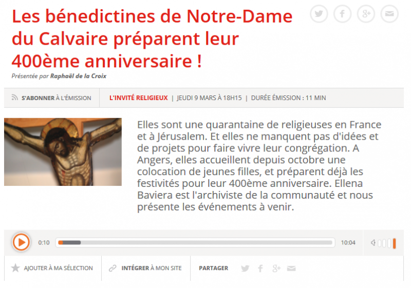 Le jeudi 9 mars 2017 à 18h15, l'archiviste des bénédictines est passée sur RCF Anjou pour parler du quatrième centenaire et, plus largement, des nombreux projets de la congrégation!