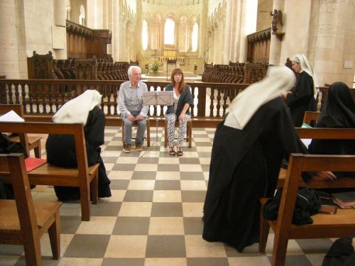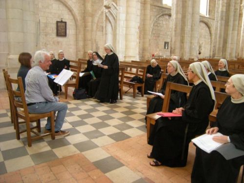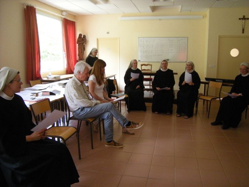 À plusieurs reprises en 2016 et 2017, nous sommes réunies à Bouzy-la-Forêt et à Prailles pour répéter les pièces musicales de nos partitions du xviie siècle que nous chanterons le premier soir du colloque à la Cathédrale. Manolo Gonzalez et Carole Matras découvrent avec beaucoup d’intérêt les pièces retrouvées dans les livres liturgiques des premières mères de la Congrégation. Sous la direction de ces musicologues passionnants, nous déchiffrons les pièces baroques qui nous replongent dans un style liturgique pour le moins dépaysant : autres temps, autres mœurs, autres répertoires liturgiques ! Nos premières mères, que nous pensions si austères, avaient un haut niveau musical, elles chantaient des kyrie et des motets sur des airs de Lulli ou autres musiciens de la Cour ! À notre modeste niveau, nous travaillons avec enthousiasme pour mettre au point quelques morceaux pour la célébration du centenaire. Une vraie joie de chanter ensemble!