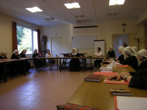 Des questions se posent : Transmettre à qui ? Comment ? Pour cette rencontre passionnante, nous sommes guidées par Catherine Marin qui enseigne l'histoire des Missions à l’Institut Catholique de Paris. Elle nous dit pour se présenter : « Je suis spécialiste des anniversaires ! Un anniversaire : c'est une prise de conscience de la richesse du passé et du devenir d'une congrégation, c'est-à-dire de la suite à donner. J'ai travaillé sur les missions du Levant (Père Joseph) : je connaissais le lien avec les Filles du Calvaire mais ne savais pas qu'il en existait encore ! Je suis heureuse de rencontrer votre Congrégation. (…) L'action du Père Joseph ne pouvait pas se faire sans vous. Son grand projet : l'unité des chrétiens, ce qui voulait dire, au xviie, le rattachement à l’évêque de Rome, et l’unité du Royaume de France. Le Père Joseph souhaitait même rassembler les souverains d’Europe autour d’un projet de croisade en Terre sainte. En priant pour la conversion des hérétiques, pour les missions diplomatiques du Père Joseph, pour la paix en Europe et le recouvrement des lieux saints, vous étiez le fer de lance contemplatif de ce vaste projet missionnaire politico-religieux de Richelieu et de son conseiller. »